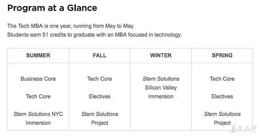 这个同样为期一年的项目,以课程来说,Stern的Tech MBA分成四个板块:Business Core、Technology Core、Stern Solutions及Elective Courses。实际时间分布如下: