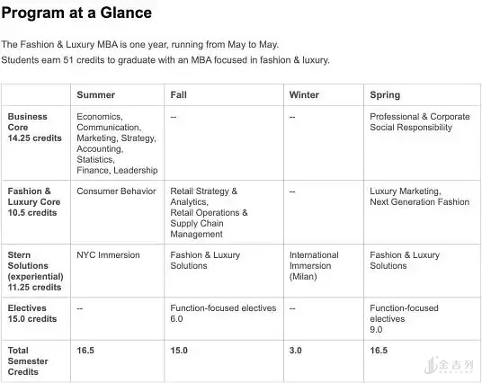 为期一年的Stern Fashion & Luxury MBA课程一样分成四个板块:Business Core、Fashion & Luxury Core、Stern Solutions、Elective Courses。课程设置长这样: