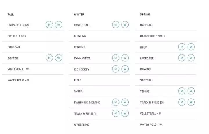 NCAA项目包括棒球、篮球、沙滩排球、保龄球、越野跑、击剑、曲棍球、美式足球(美式橄榄球)、高尔夫、体操、冰球、棍网球、步枪射击、赛艇、滑雪、足球、垒球、游泳&跳水、室内田径、室外田径、排球、水球、摔跤。