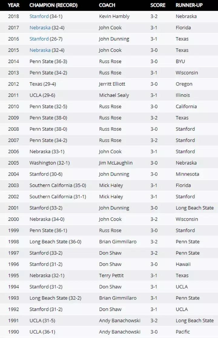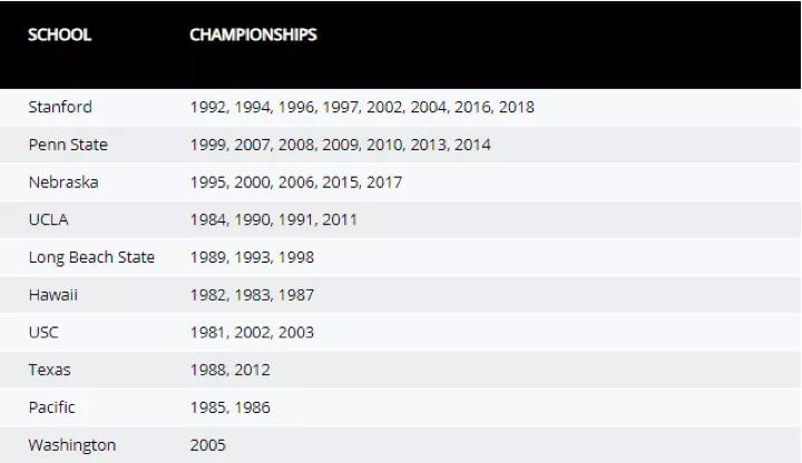 纵观历年NCAA女排冠军学校,斯坦福大学,宾州州立大学和内布拉斯加大学位列前三名,分别获得8次、7次和5次冠军。