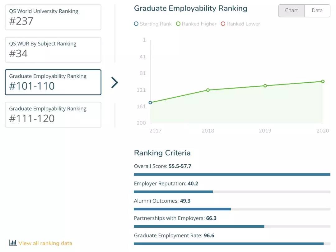 麦考瑞虽然不是八大,雇主声誉、校友成就和雇主与学生联系的评分也较低。但是就业竞争力逐年提高。学生的毕业就业率也达到了96.6%。