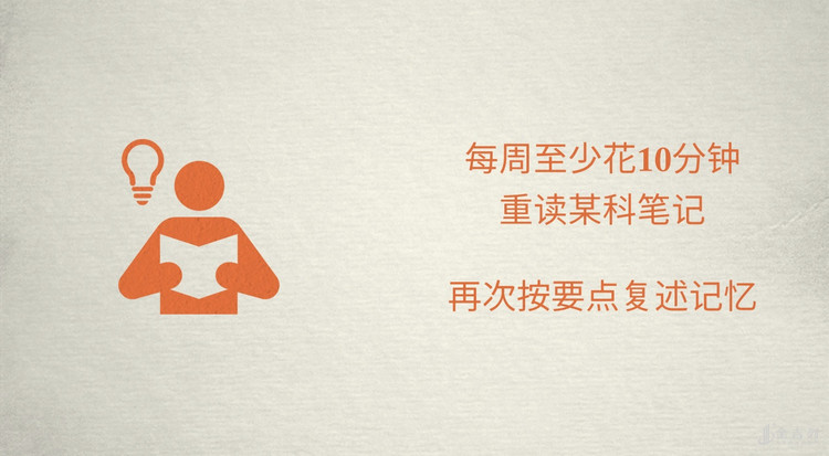 每周花十分钟左右时间,快速复习笔记,主要是先看“线索”部分,适当看看“笔记”部分。
