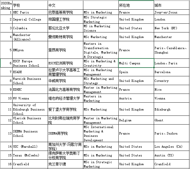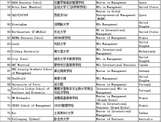 管理学硕士(Masterin Management)专业,全球共有128个相关硕士项目参与排名 。巴黎HEC商学院再次成为世界上管理学硕士学位的最佳机构。