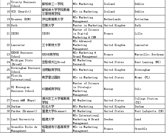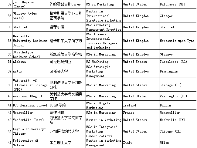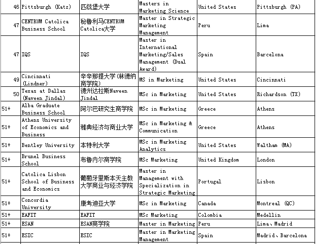 四、QS Business Masters Rankings:Marketing市场营销