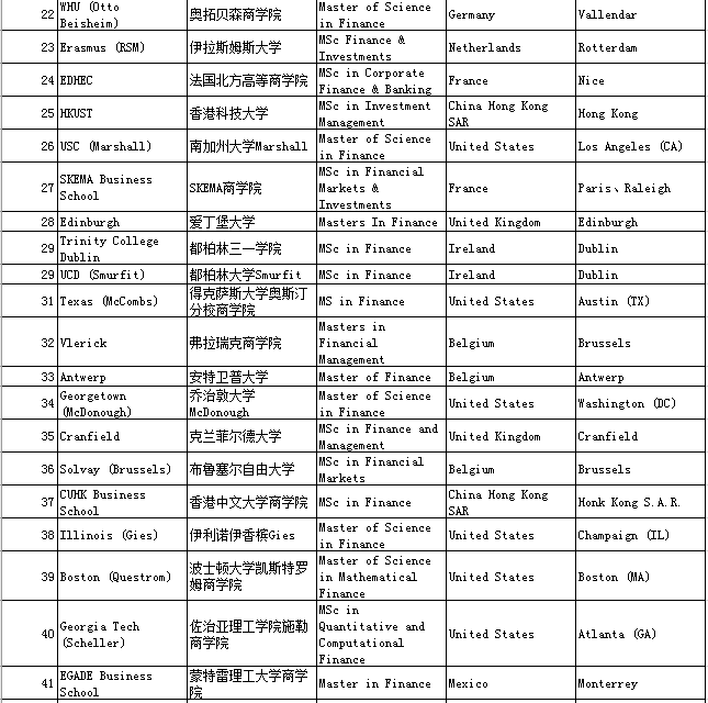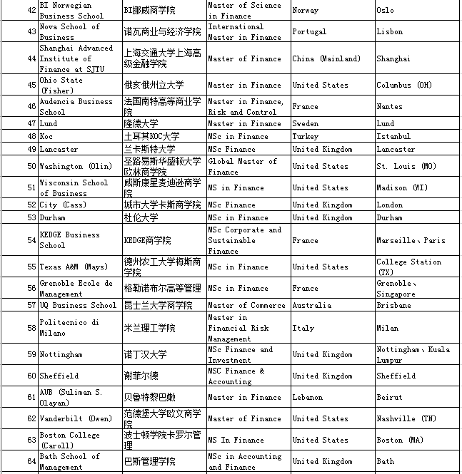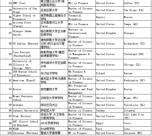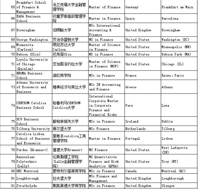 二、QS Business Masters Rankings:Finance金融