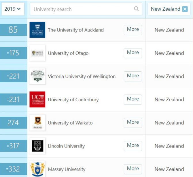 2019QS 大学排行榜新鲜出炉, 下面节选了新西兰八所国立大学的全球排名,其中奥克兰大学稳居全球前一百名,有五所大学位居全球前三百名。