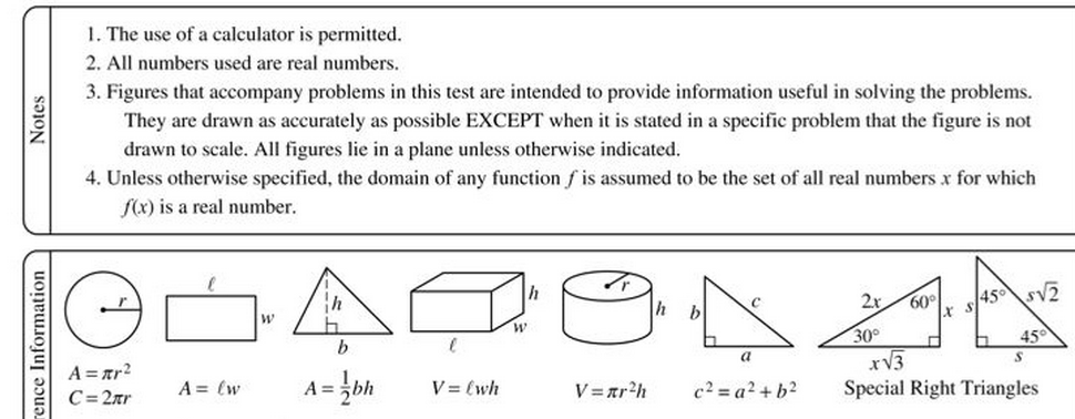 数学:共44道选择题和10道填空题 包括美国教育系统内代数一、代数二和几何课程的内容(相当于中国初中绝大多数和高中一小部分的知识点), 不包括绝大多数预备微积分(相当于中国高中数学)及更深课程的内容。