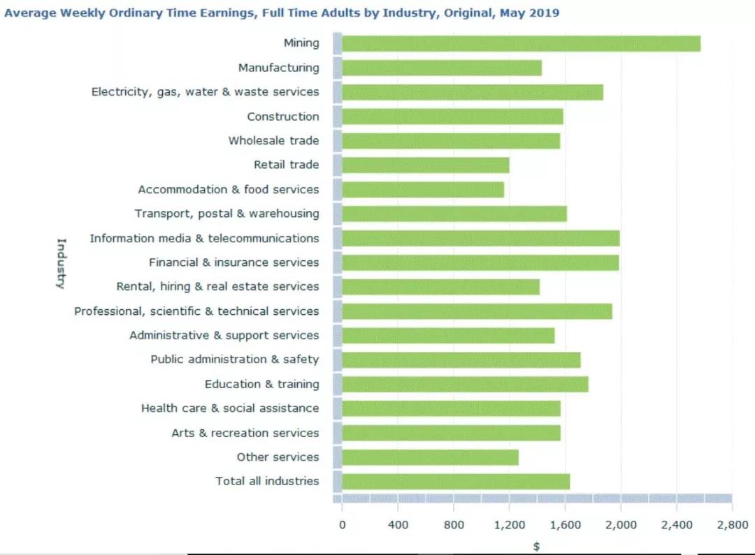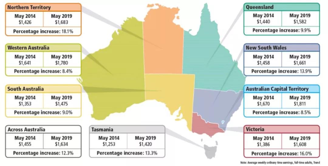 上个月底,澳大利亚统计局(Australian Bureau of Statistics,ABS)发布了最新的收入数据,2019年5月的澳大利亚成年人的平均周薪为1634澳元,西澳的薪资均值为$1780/周,冠绝全澳大州之首,仅仅以31$稍逊于堪培拉首都地区。