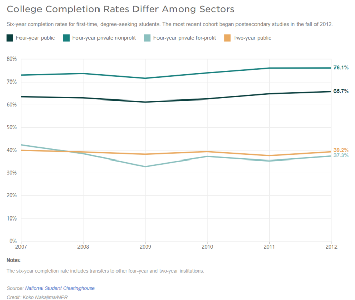 四年制私立学校毕业率,比四年制公立学校毕业率高; 两年制社区学院和营利性四年制学校的平均毕业率都低于 40% 。