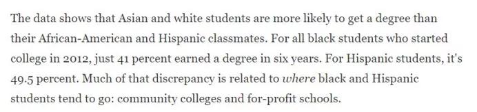 2012年开始上大学的所有黑人学生中,只有 41% 的人在6年内获得了学位。对西班牙裔学生来说,这是 49.5% 。