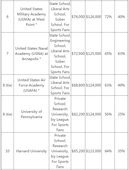 如果我们将注意力放在毕业生的早起薪资状况,那么精英军事院校的毕业生可以将是一方独大的。像是西点军校和美国海军学院的毕业生的薪资要比其他学生高出很多,像这样的有军旅背景的毕业生更受用人单位的青睐。