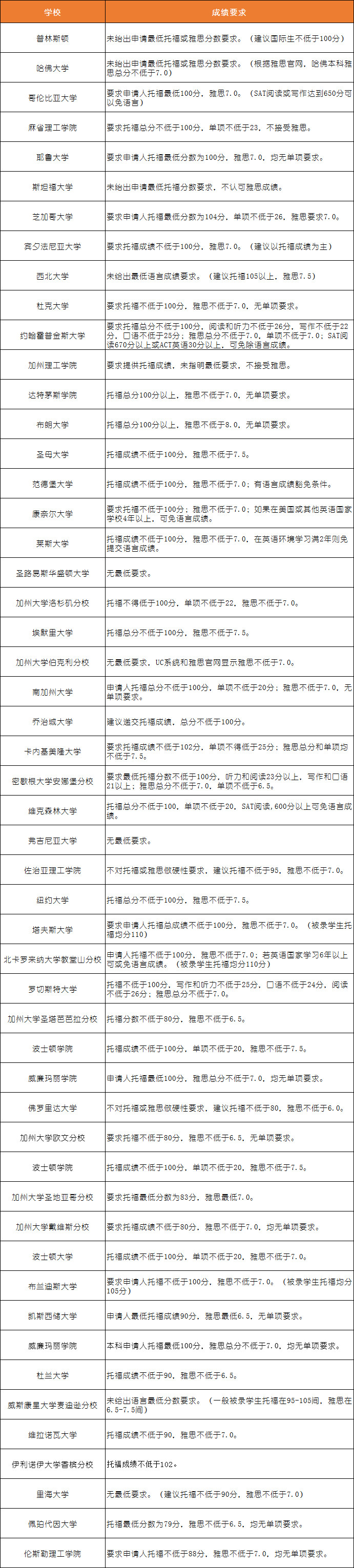 美国TOP50大学雅思/托福成绩要求(本科)
