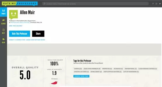 Rate my professor 是上过这门课的学长和学姐来给教授评分的网站。输入自己的学校和教授名字,你可以看到所有人对于这个教授的评价,以及学长学姐上这节课的经验。比如你要上 Allen Muir 教授的课,你查看大家的评价发现课程难度是 3 分,课程质量是 5 分。大家上这节课不是拿 A 就是 A- ,而且所有人都盛赞这个老师。所以,如果你在选课的时候网速够快,能抢得到位置的话,一定要选这节课!