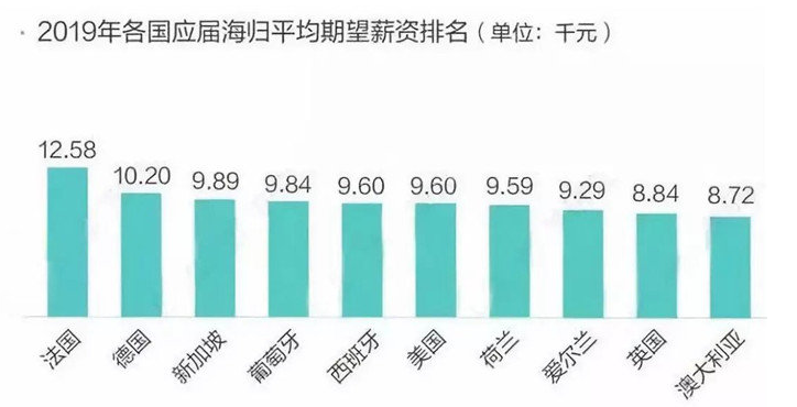 美国和英国是中国学生的两大主要留学目的国家,2019年海归留学生的平均期望工资分别为9597元和8838元,分别排名第六和第九。