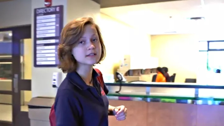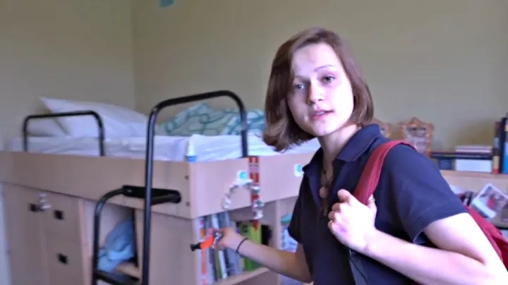 Clara: 现在我们到了 Pine Girls 女生宿舍,进去看看。这里是前厅,左边有自助餐厅,我们在那里吃晚饭,还有早午餐。这里有前台与舍监,他们会帮助你,回答你的所有问题。