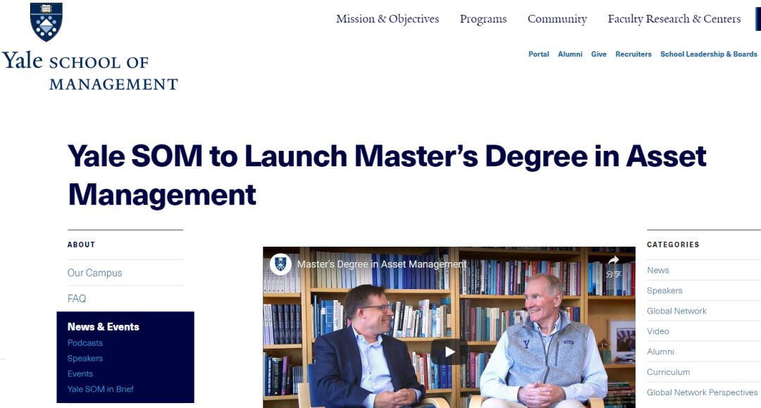 今年 8 月,耶鲁大学管理学院 Yale University's School of Management 新增“资产投资管理”硕士学位 Master’s Degree in Asset Management ,学制一年,由金融学教授 Tobias J. Moskowitz 开发并将担任教务主任。