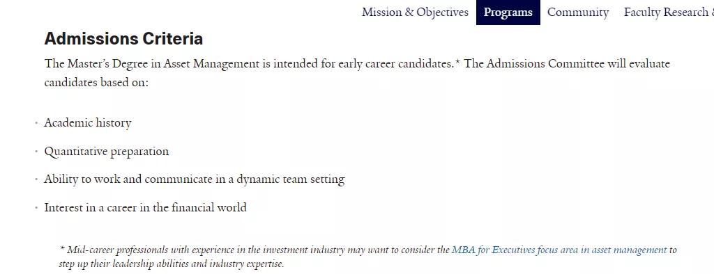 资产投资管理硕士主要针对 应届毕业生以及不超过 3 年工作经验 的职场人士,要有一定学识,具备较强数学背景,选修过高级统计、概率数学课程,以及有一定计算机、微积分、经济学等知识,对金融行业有兴趣,擅长团队沟通。