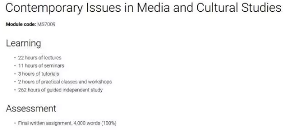 本课程讨论媒体和文化研究中四个不同子领域出现的关键问题,特别是电视研究,全球媒体研究,新闻研究和名人文化。