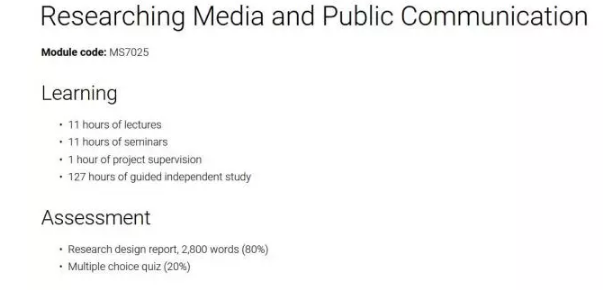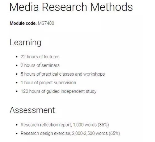 一篇2000-2500字的Research esign exercise(比重65%)。导师会给出大概三到四个案例,并给出详细的研究要求,比如如何收集资料,为何选择使用某种研究方法,资料的内容分析等。即需要大家收集资料或者设计调查问卷来完成这项作业。