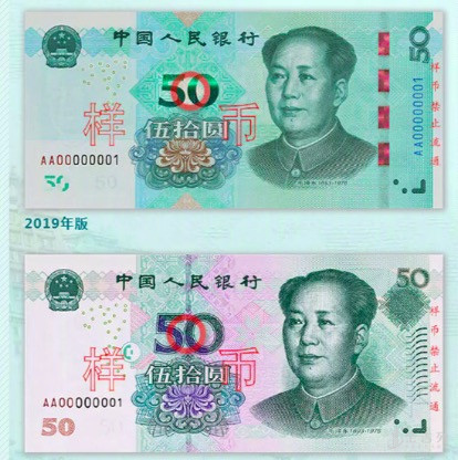 取消 左下角光变油墨面额数字、 取消 右侧凹印手感线、左侧 增加 装饰纹样、右侧 增加 动感光变镂空开窗安全线、右侧 增加 竖号码、中部面额数字 调整 为光彩光变面额数字“ 50 ”、 调整 中部装饰团花的样式、 调整 左侧横号码的样式、 调整 左侧胶印对印图案的样式、 调整 右侧毛泽东头像的样式、 调整 右上角面额数字的样式、 取消 全息磁性开窗安全线、 取消 右下角局部图案、 调整 主景的样式、 调整 面额数字的样式、 调整 胶印对印图案的样式、年号 改为 “ 2019 年“等等。