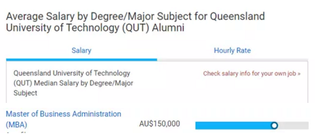 昆士兰科技大学MBA的校友平均年薪达到150,000澳元,在全世界的商学院中,这个平均年薪堪称佼佼者。除了MBA之外,在高等教育评估机构Euniversal发布的2017最佳硕士课程排名中,QUT的会计学、战略广告、应用金融、管理学、人力资源管理、国际商务和市场营销硕士课程名列前茅。