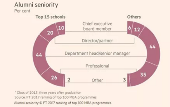 根据《金融时报》的调查显示,攻读MBA学位对未来职业规划的发展起着重要的作用,10%的人毕业后成为了公司高管,20%成为了企业的主管或合伙人,44%成为了部门经理,26%从事着专业性工作。