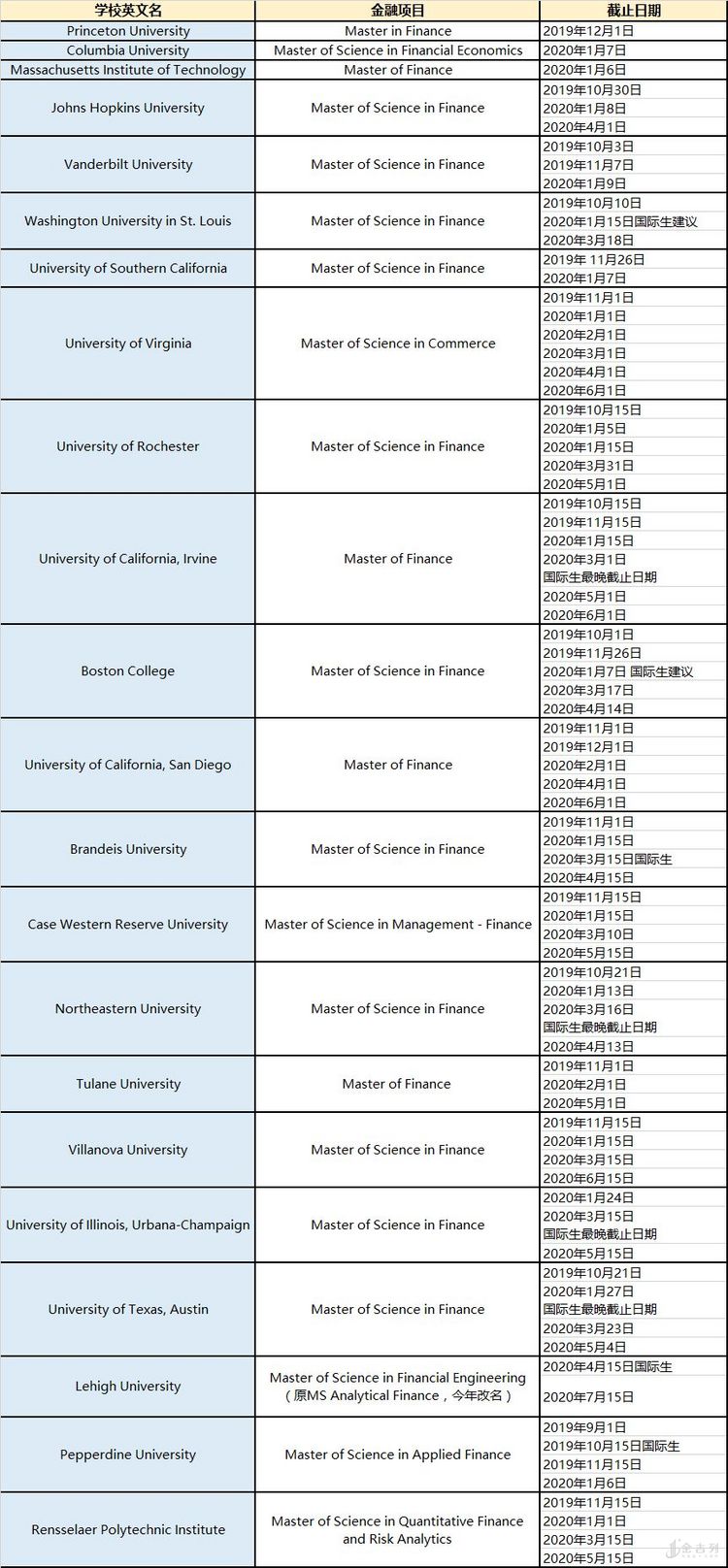 以下 只包括2020年秋季入学 的金融硕士专业项目截止日期,不包括春季项目截止日期。