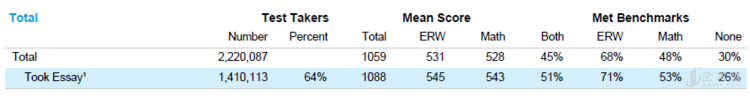 5、在2019届考生中,共有45%的学生达到大学基准线,有64%的考生参加了Essay考试,(尽管一部分大学说不需要写作成绩,但依然有很多学生选择了这部分考试)。