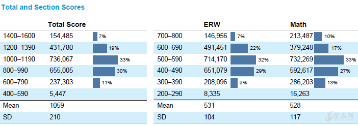 SAT总分是ERW(阅读与写作)和数学部分的总分,单项分数范围为200–800,因此总分数范围为400–1600。大学和职业准备水平测试的依据是:ERW和数学分别为480和530。