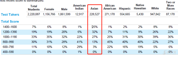 亚洲学生在高分数段的表现太亮眼了,这也就是大家刷到1500分,还没足够信心申请梦校的原因,高分太多,靠标化分数体现不出明显优势。