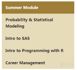 Summer moule主要学习内容包括概率论统计建模,R和SAS代码编写。确保学生掌握完成BA项目的技术技能和知识,同时也早早开设职业规划课程,帮助学生探索职业选择,为将来就业做好准备。