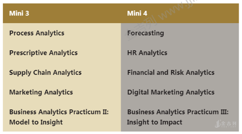 春季同样也是分为mini moules, 课程结合实际、应用型更强。加强学生开发数学模型的能力,从而更好的做出预测,最优化,以及可行决策;学生掌握以数据为驱动的方式,从公司运营的各个角度,涵盖市场营销、供应链、人力资源、金融产品等去分析。