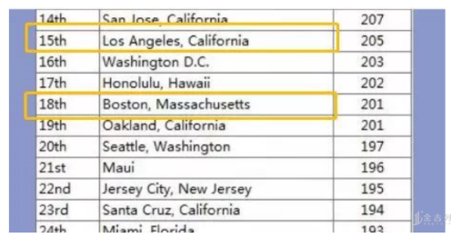 Expatistan 网站通过对美国各大城市的各种生活消费进行实时对比调查,将各地的消费指数进行了排名,我们可以看到,洛杉矶和波士顿其实消费水平差不多,毕竟都是大都市。