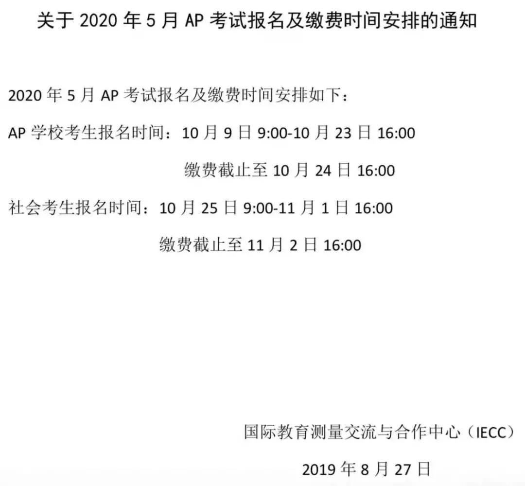 2020年5月AP考试报名即将开始!不过AP学校考生和社会考生报名时间有些不同,具体时间如下: