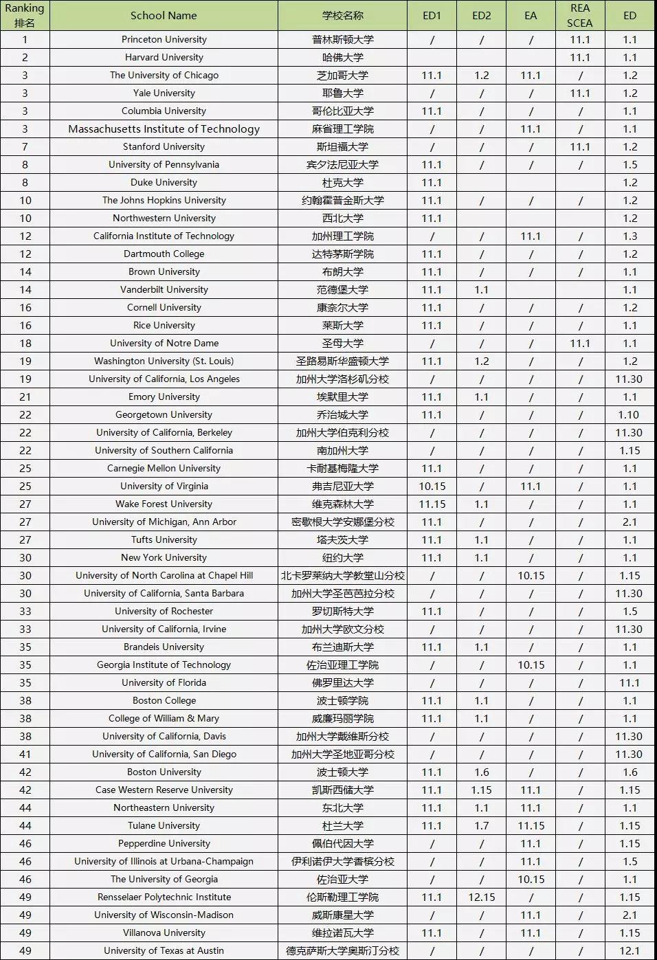 为了给让各位学生和家长更直观的看到美国本科的申请时间,俞老师整理了了美国TOP50院校(综合性大大学)的截止日期(包含了早申请和正常申请)。
