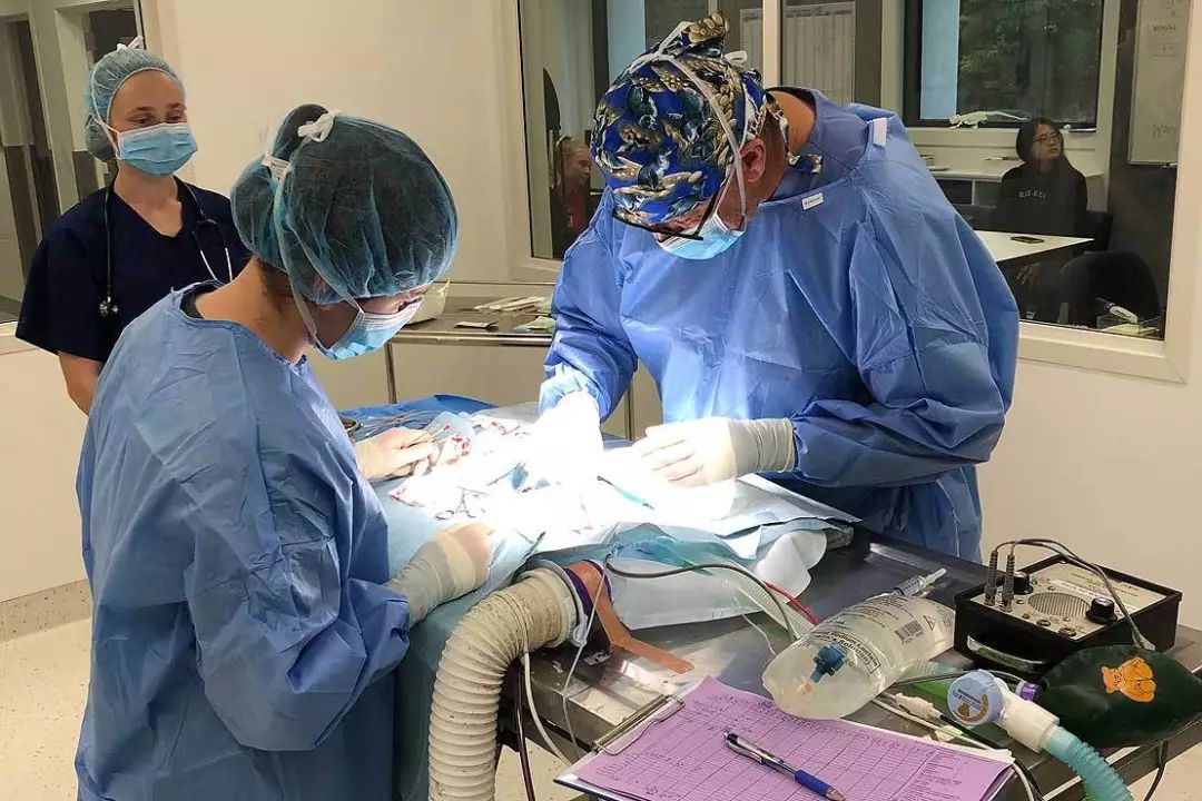 这场 史无前例的手术由Gartrell教授带领的梅西大学兽医团队操刀完成。手术中, Brett Gartrell和工作人员小心地将鸮鹦鹉的部分大脑皮肤剥离,以观察是否能够将突出的那块大脑组织推回至颅骨内。但他们发现,突出部分的大脑组织过厚,推回计划受阻。随后,Gartrell和同事选择将突出部分的大脑及相关组织切除,然后在鸮鹦鹉的颅骨上放置一个网状移植物,起到固定和覆盖的作用,这个如蹦床般的网状物可以将鸮鹦鹉的整个颅骨向上拉伸,促进愈合。最终,Brett Gartrell和同事在网状物中注入从鸮鹦鹉身上取下来的骨髓,以缩小其头部的颅骨缝隙。