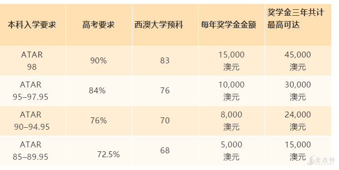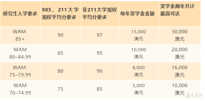 - 奖学金的具体金额由获得者的同等澳大利亚高等教育入学考试分数(ATAR)或加权平均分数(WAM)而决定。