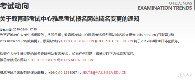 2019年9月4日起,教育部考试中心雅思考试报名网站域名正式变更IELTS.NEEA.CN 或 IELTS.NEEA.EDU.CN,原网站域名将于2019年9月10日停止服务。