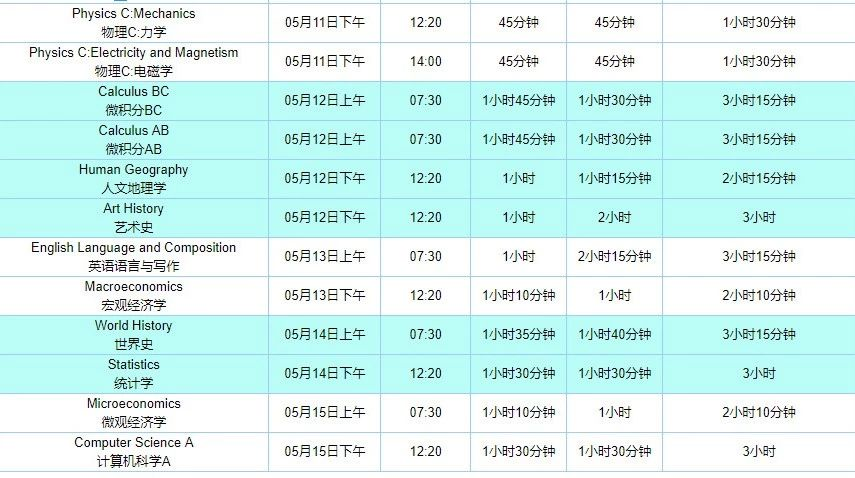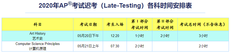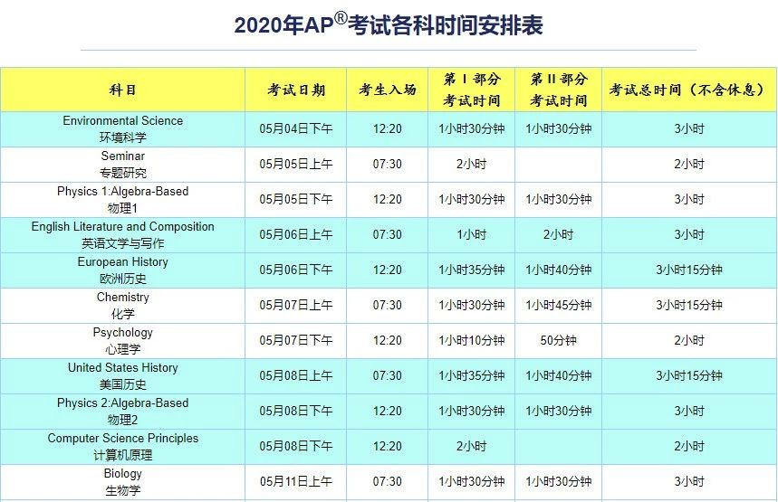 2020年AP考试各科时间安排表