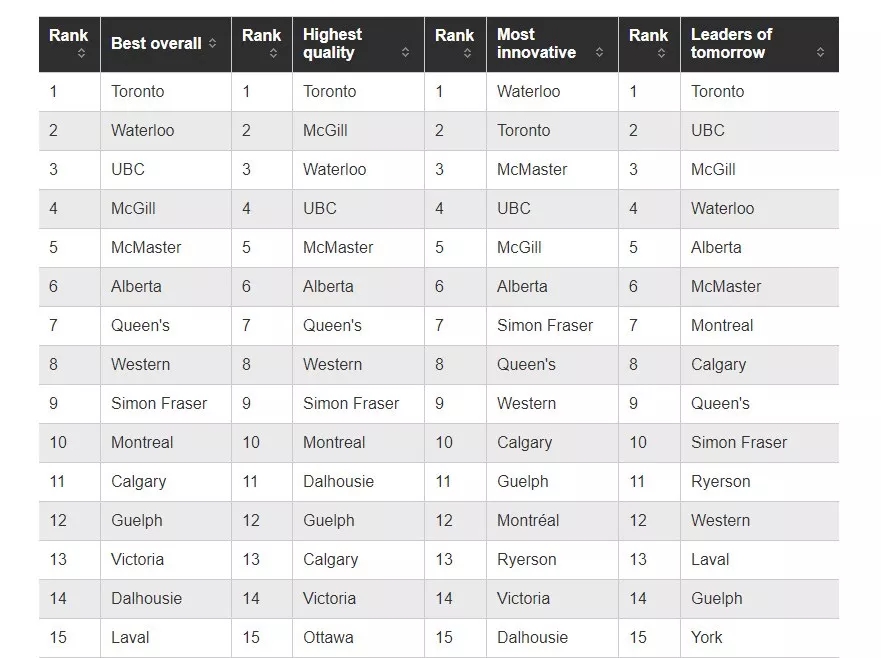 这份排名的参考价值在于,排名的依据来源于大学教授以及高级管理人员,加拿大高中升学指导老师,以及最重要的:遍布加拿大各省各行业的企业人士,从而得到他们对于大学教学质量以及创新能力的评价。也就是说,这份榜单最直观可以看到,究竟哪些大学的毕业生雇主评价最高。