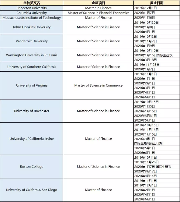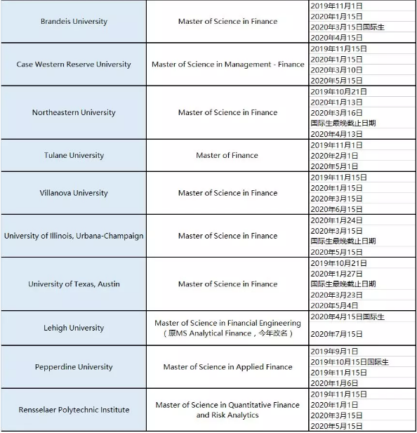 以下只包括2020年秋季入学的金融硕士专业项目截止日期,不包括春季项目截止日期。