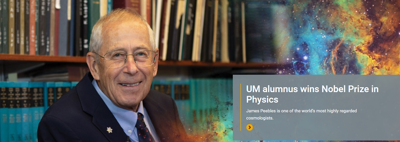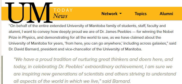 结果一出,天文物理界轰动,而这所大学也沸腾了。那就是加拿大曼尼托巴大学University of Manitoba。因为皮布尔斯教授于1935年出生在加拿大温尼伯,并在曼尼托巴大学完成物理学学士学位,在1958年秋天才离开曼大,入读普林斯顿大学攻读其博士Ph学位。