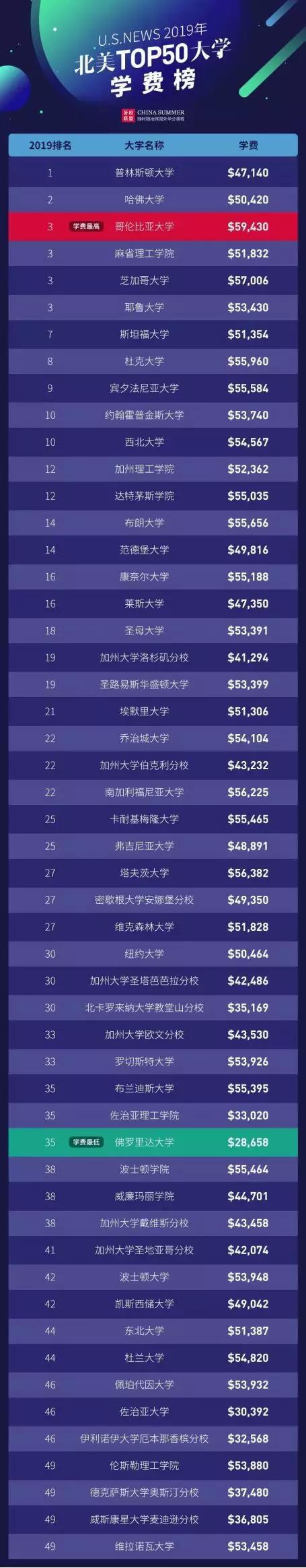 下面是U.S.NEWS 2019年北美top50大学的学费一览: