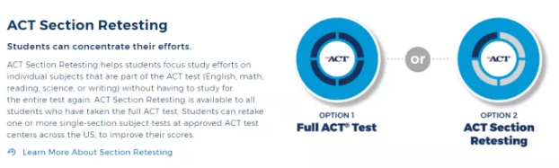 考生可以选择ACT五门科目中(英语,数学,阅读,科学和写作)的其中一项或多项进行重考,所考内容和单项时间和之前并无差别;