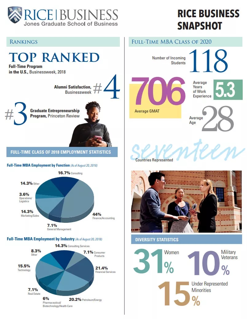 如果是在职学生,Rice Professional MBA是适合你的计划。 该计划灵活提供兼职(晚上或周末)选项,以满足当今职业加速器的需求,以及扩展格式,以允许那些希望在三年(或最多五年)内完成该计划的人,而不是传统的两年。