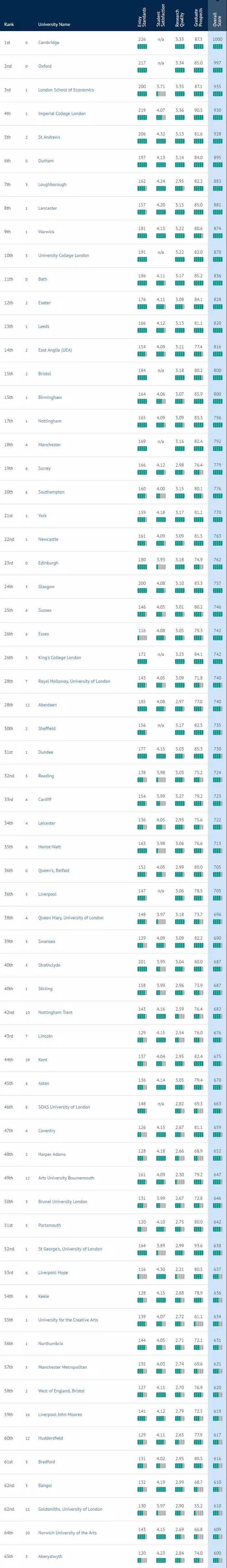 完全大学指南是由Mayfiel University Consultants梅菲尔大学研究中心进行整理编制的,每年4月发布,CUG排名共有10个排名标准: