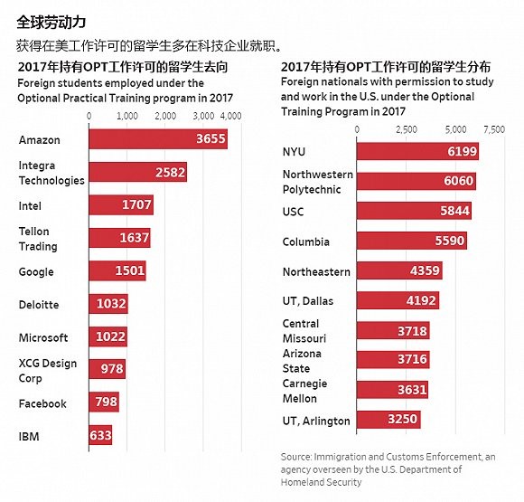 亚马逊和谷歌等科技企业排名靠前,名气也最大,近半数入职的留学生都来自印度和中国。这些留学生招聘大户也为他们的国外员工申请了大量H-1B工作签证,延长工作期限。