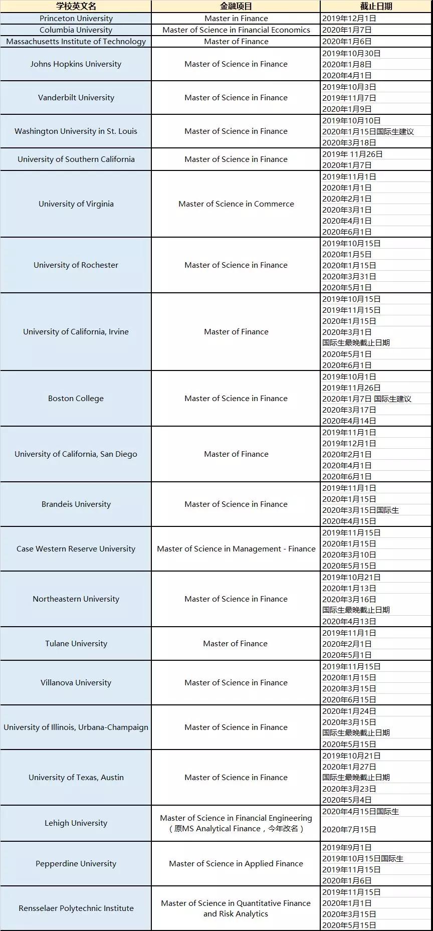 以下只包括2020年秋季入学的金融硕士专业项目截止日期,不包括春季项目截止日期。