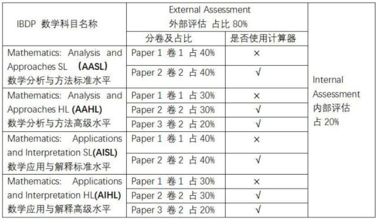 在考试评估方面,与现有的考核是类似的,新的DP数学课程SL将完成两份外部评估试卷和一份内部评估;HL将完成三份外部评估和一份内部评估。而对于内部评估(IA),学生可以选择自己感兴趣的话题进行评估,占数学最终总成绩的20%。