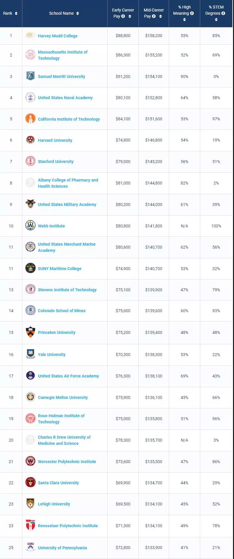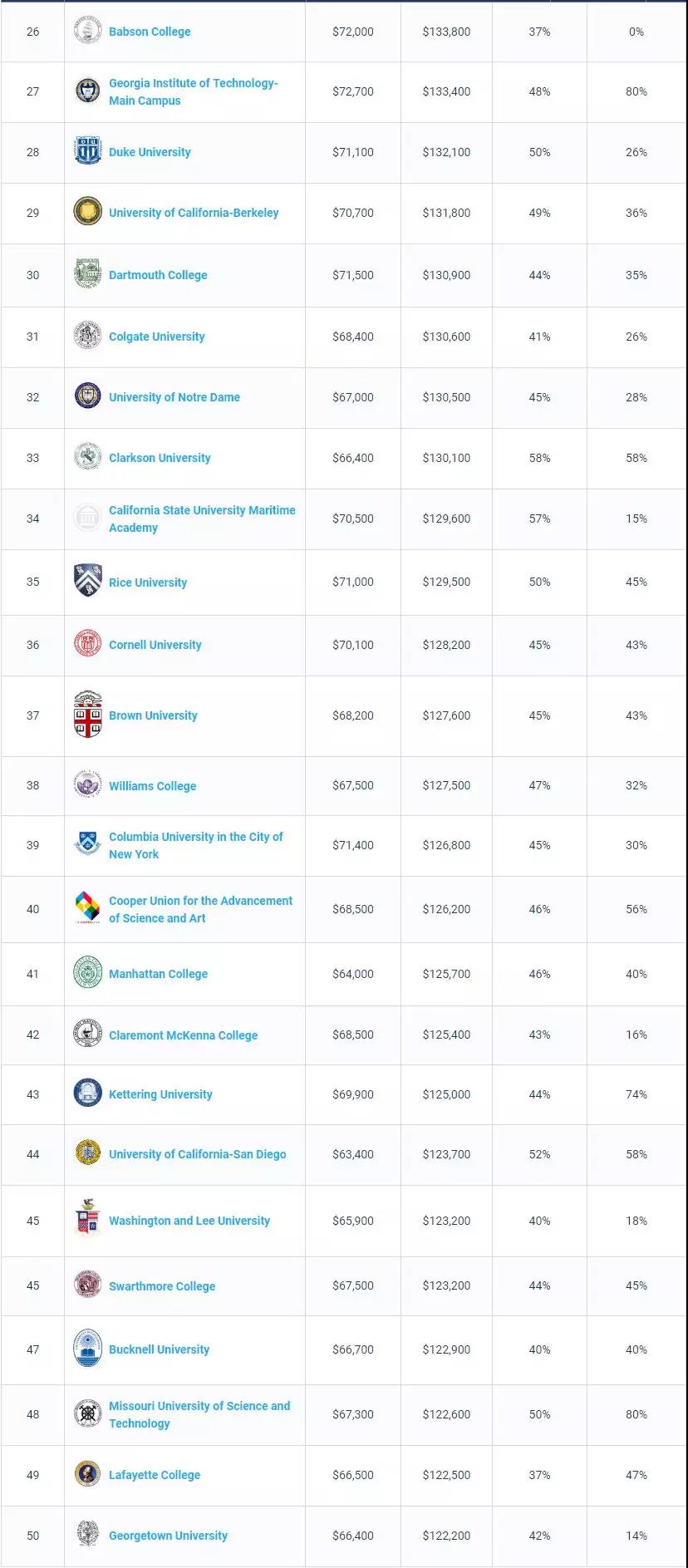 PayScale2019-2020美国本科毕业生薪酬排名TOP50